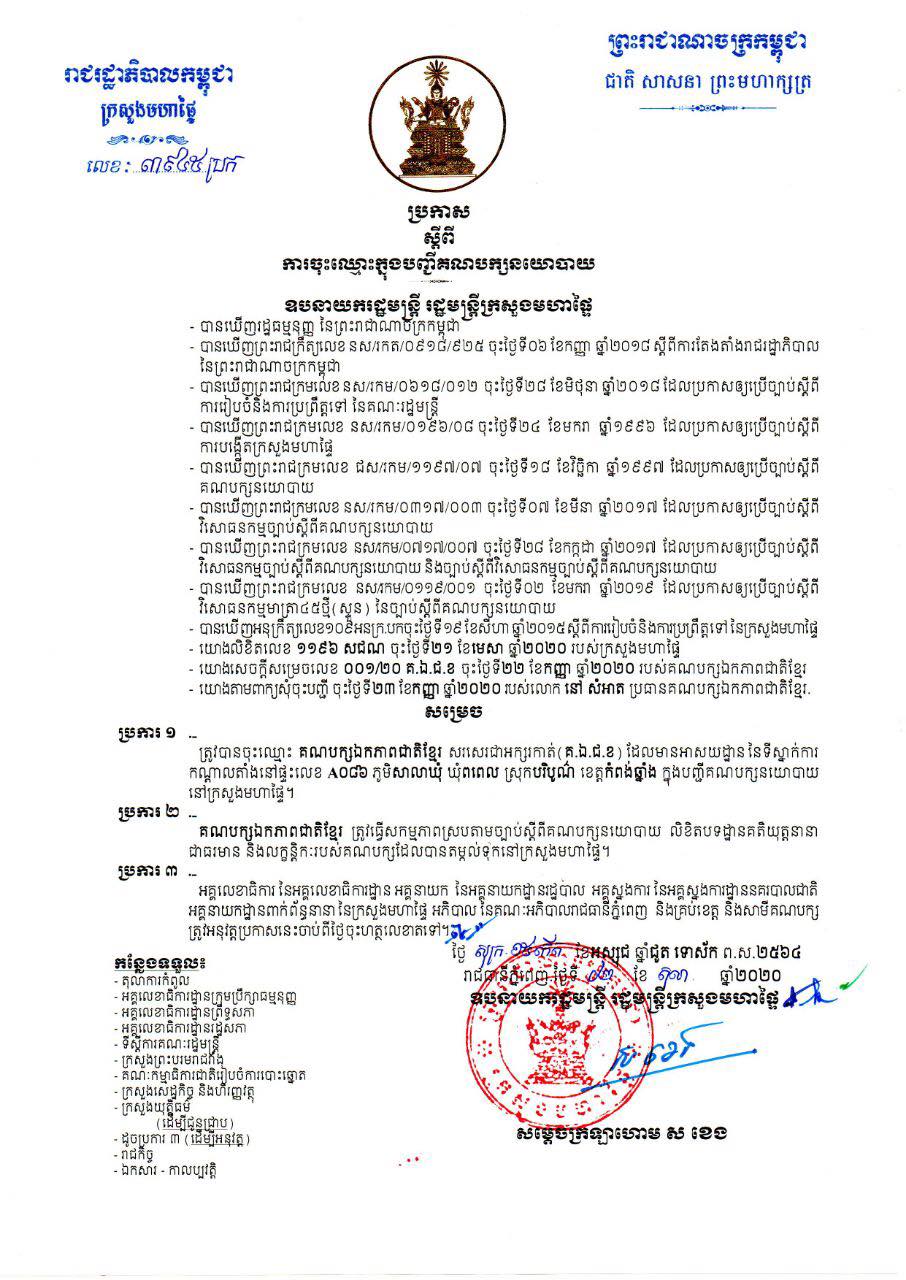 ក្នុងលិខិត សម្តេចក្រឡាហោម បានបញ្ជាក់ថា «ក្រសួងមហាផ្ទៃ បានសម្រេចបញ្ចូលគណបក្សឯកភាពជាតិខ្មែរ ដែលមានឈ្មោះសរសេរជាអក្សរកាត់ «គ.ឯ.ជ.ខ» ដែលមានទីស្នាក់ការកណ្ដាលតាំងនៅផ្ទះលេខA០៨៦ ភូមិសាលាឃុំ ឃុំពពេល ស្រុកបរិបូណ៌ ខេត្តកំពង់ឆ្នាំង ក្នុងបញ្ជីគណបក្សនយោបាយនៅក្រសួងមហាផ្ទៃ ជាផ្លូវការ និងអនុញ្ញាតឲ្យធ្វើសកម្មភាពស្របតាមច្បាប់ ស្តីពីគណបក្សនយោបាយ លិខិតបទដ្ឋានគតិយុត្តនានាជាធរមាន និងលក្ខន្តិកៈរបស់គណបក្ស ដែលបានតម្កល់ទុកនៅក្រសួងមហាផ្ទៃ»។